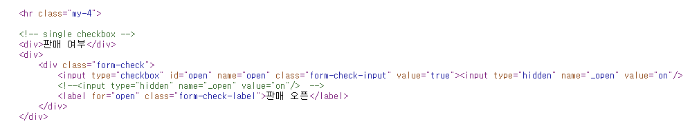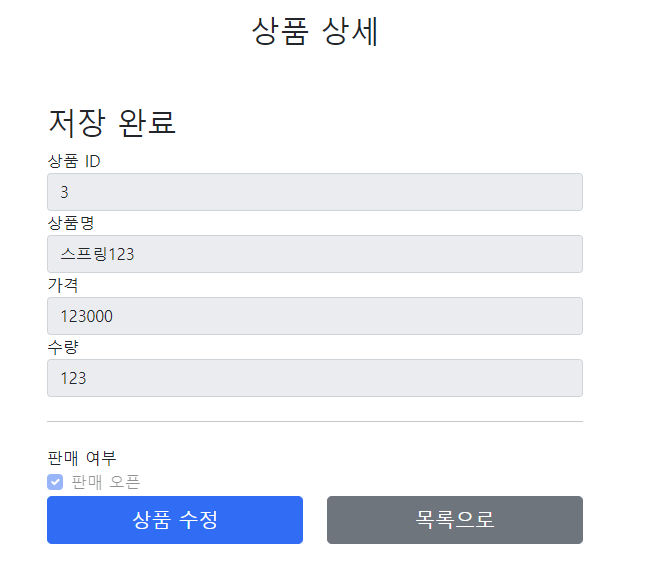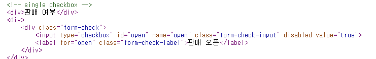 체크 박스에서 판매 여부를 선택해서 저장하면, 조회시에 checked 속성이 추가된 것을 확인할 수 있다.
