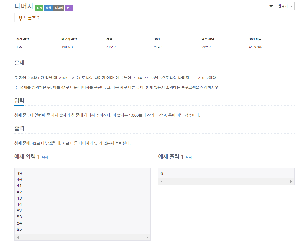 첫째 줄에, 42로 나누었을 때, 서로 다른 나머지가 몇 개 있는지 출력한다.