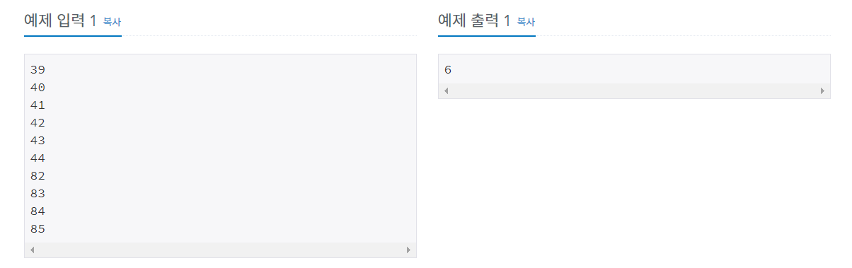 39, 40, 41, 42, 43, 44, 82, 83, 84, 85를 42로 나눈 나머지는 39, 40, 41, 0, 1, 2, 40, 41, 0, 1이다. 서로 다른 값은 모두 6개가 있다.