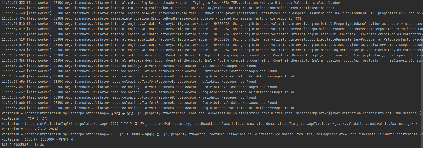 violation = ConstraintViolationImpl{interpolatedMessage='공백일 수 없습니다', propertyPath=itemName, rootBeanClass=class hello.itemservice.domain.item.Item, messageTemplate='{javax.validation.constraints.NotBlank.message}'}