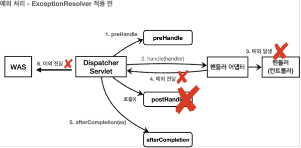 만약 처리할 수 있는 ExceptionResolver 가 없으면 예외 처리가 안되고, 기존에 발생한 예외를 서블릿 밖으로 던진다.