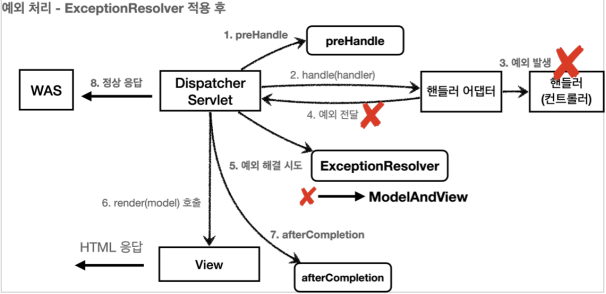 ExceptionResolver 를 활용하면 예외가 발생했을 때 이런 복잡한 과정 없이 여기에서 문제를 깔끔하게 해결할 수 있다
