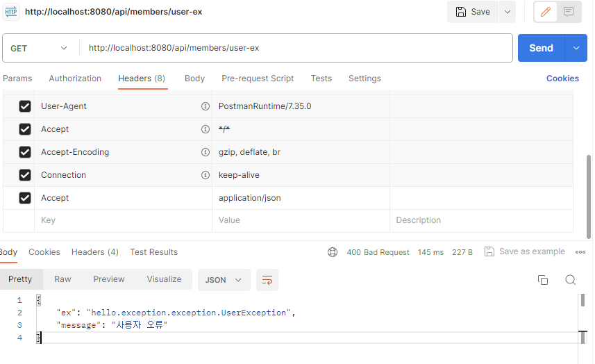 http://localhost:8080/api/members/user-ex 호출시 UserException 이 발생하도록 해두었다.