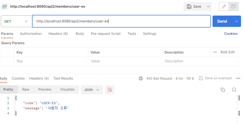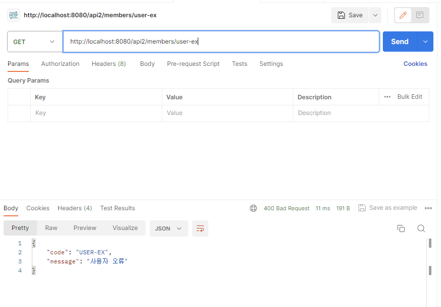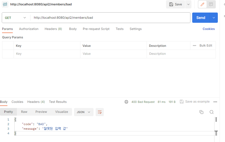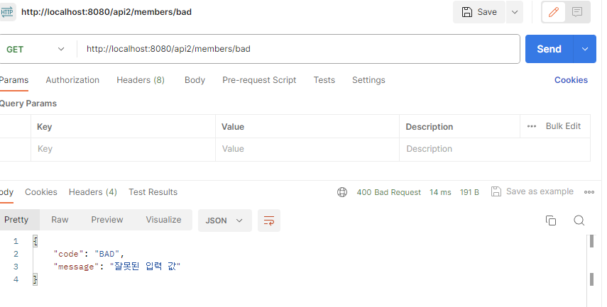 5) @ResponseStatus(HttpStatus.BAD_REQUEST) 를 지정했으므로 HTTP 상태 코드 400으로 응답한다