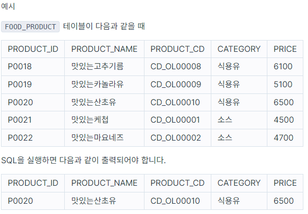 다음은 식품의 정보를 담은 FOOD_PRODUCT 테이블입니다. FOOD_PRODUCT 테이블은 다음과 같으며 PRODUCT_ID, PRODUCT_NAME, PRODUCT_CD, CATEGORY, PRICE는 식품 ID, 식품 이름, 식품 코드, 식품분류, 식품 가격을 의미합니다.