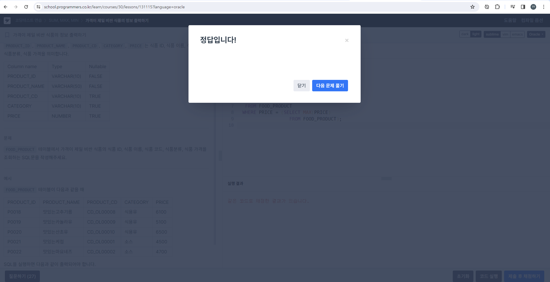 그리고 WHERE 문에 값이 최고치인 것 중에서 같은 걸 골라 SELECT 문에 출력하면 된다.