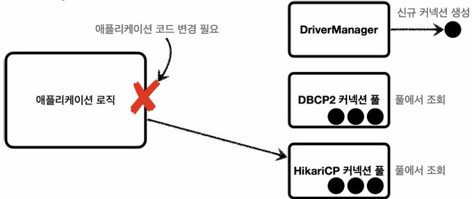 예를 들어서 애플리케이션 로직에서 DriverManager 를 사용해서 커넥션을 획득하다가 HikariCP 같은 커넥션 풀을 사용하도록 변경하면 커넥션을 획득하는 애플리케이션 코드도 함께 변경해야 한다. 의존관계가 DriverManager 에서 HikariCP 로 변경되기 때문이다. 물론 둘의 사용법도 조금씩 다를 것이다