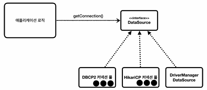 - 대부분의 커넥션 풀은 DataSource 인터페이스를 이미 구현해뒀다. 따라서 개발자는 DBCP2 커넥션 풀, HikariCP 커넥션 풀의 코드를 직접 의존하는 것이 아니라 DataSource 인터페이스에만 의존하도록 애플리케이션 로직을 작성하면 된다.