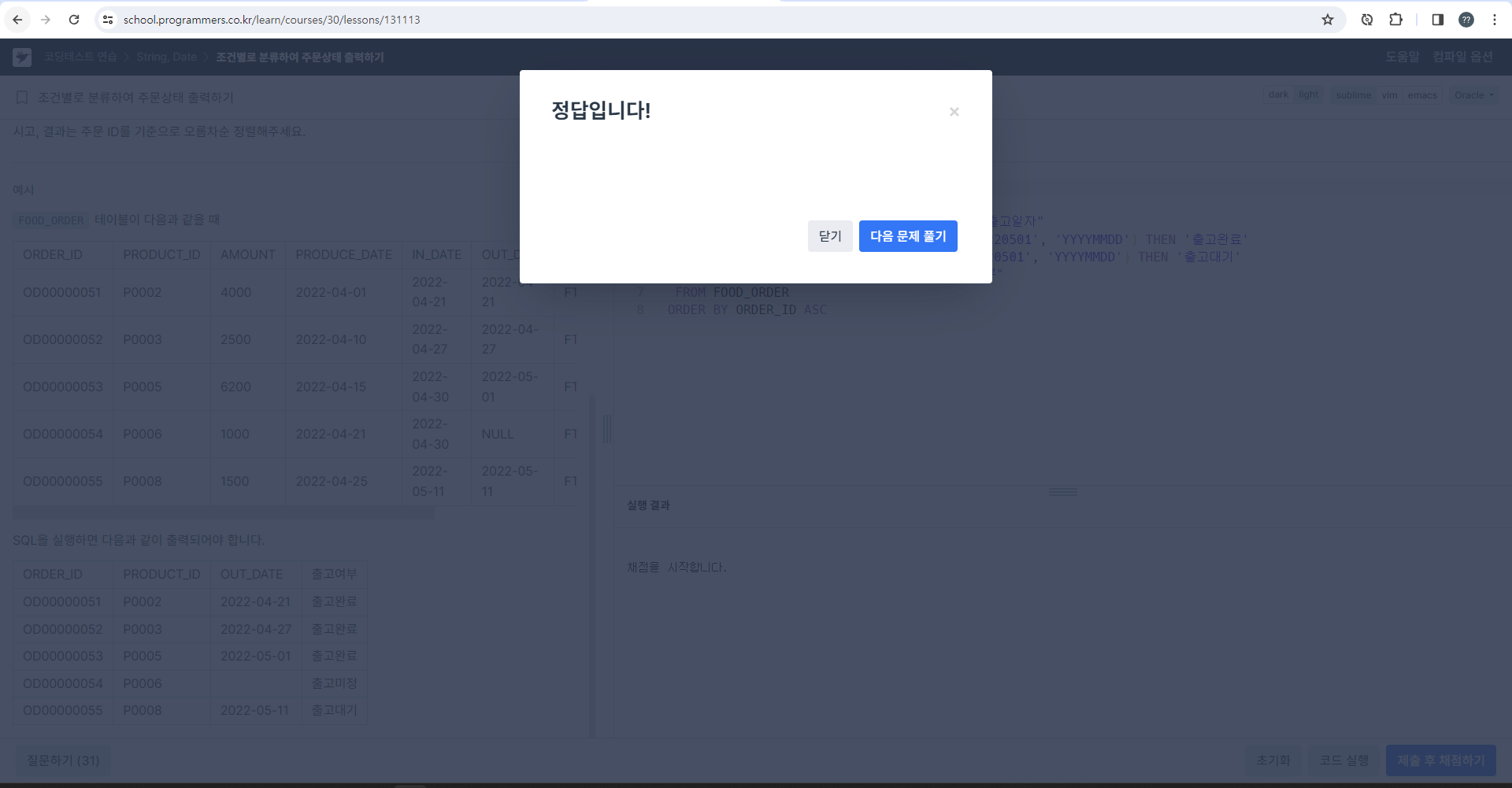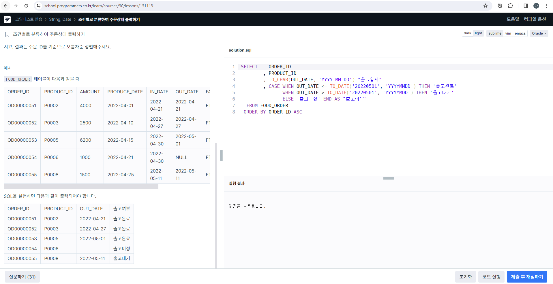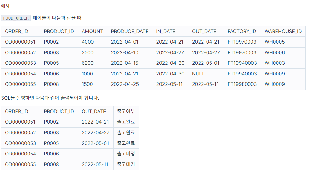 처음엔 출고여부만 신경써서 풀다가, 계속 오답이 나길래 OUT_DATE의 형식을 봤더니 YYYY-MM-DD 형식이다.