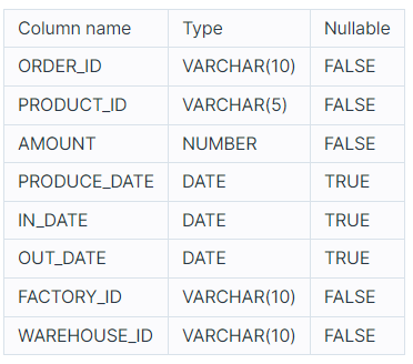 ORDER_ID, PRODUCT_ID, AMOUNT, PRODUCE_DATE, IN_DATE,OUT_DATE,FACTORY_ID, WAREHOUSE_ID는