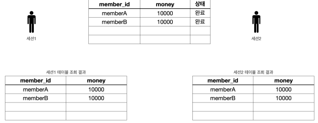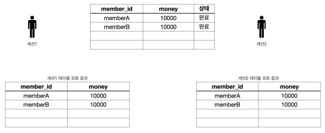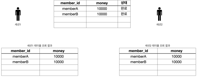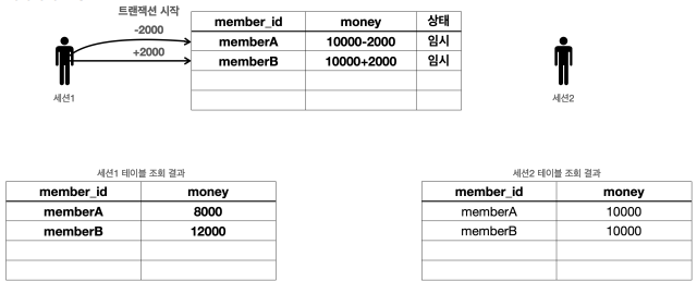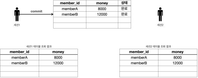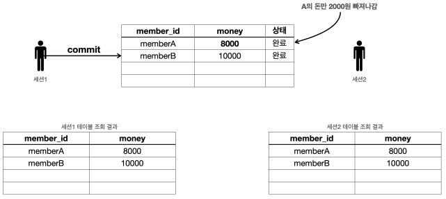 - 다른 세션에서도 memberA 의 금액이 8000원으로 줄어들고, memberB 의 금액이 12000원으로 증가한 것을 확인할 수 있다.