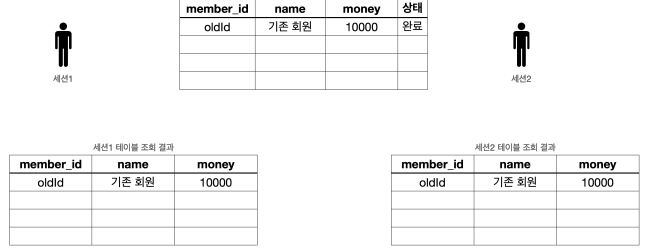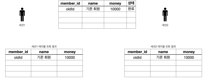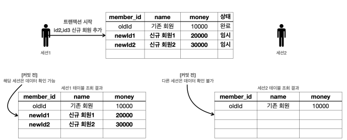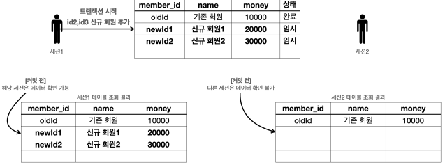 다른 세션(사용자)에게는 변경 데이터가 보이지 않는다. - 등록, 수정, 삭제 모두 같은 원리로 동작한다
