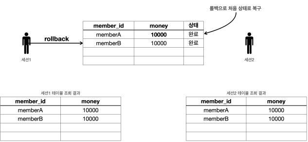 - 세션1이 데이터베이스에 반영한 모든 데이터가 처음 상태로 복구된다.