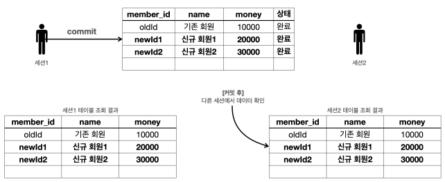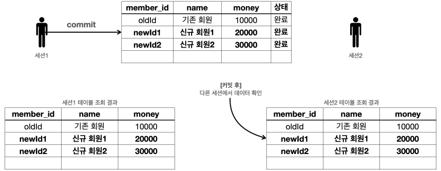 결과를 이미지와 비교해보자. 세션1이 트랜잭션을 커밋했기 때문에 데이터베이스에 실제 데이터가 반영된다.