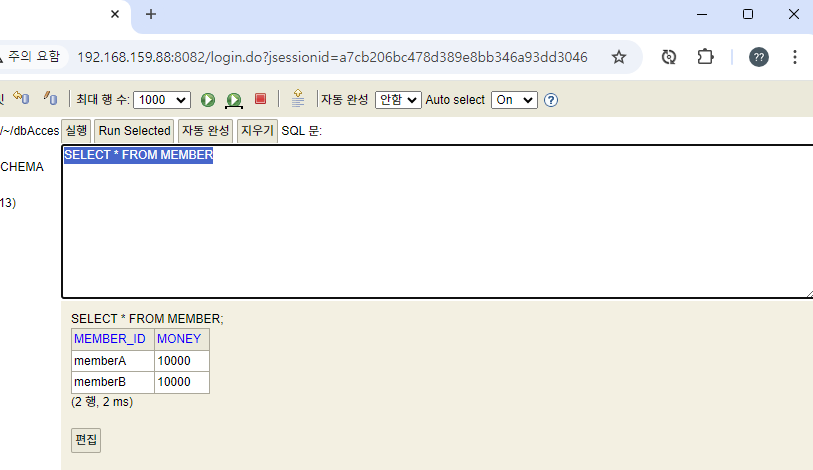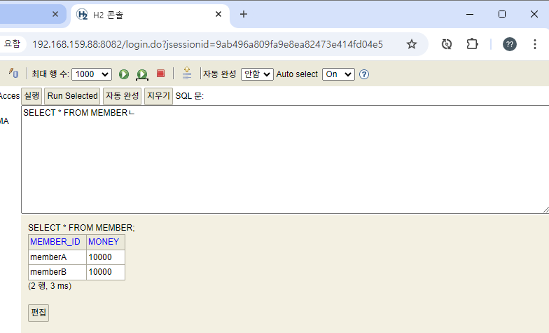 memberA 의 돈도 이전 상태인 10000원으로 돌아오 고, memberB 의 돈도 10000 원으로 유지되는 것을 확인할 수 있다.