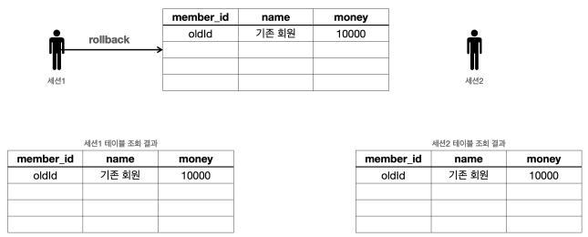 세션2에서 세션1이 아직 커밋하지 않은 변경 데이터가 보이다면, 세션1이 롤백 했을 때 심각한 문제가 발생할 수 있다. 따라서 커밋 전의 데이터는 다른 세션에서 보이지 않는다.