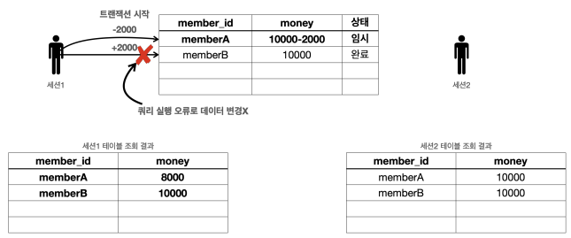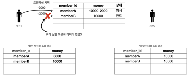 그래서 memberA 의 돈을 2000원 줄이는 것에는 성공했 지만, memberB 의 돈을 2000원 증가시키는 것에 실패한다. - 두 번째 SQL은 member_iddd 라는 필드에 오타가 있다.