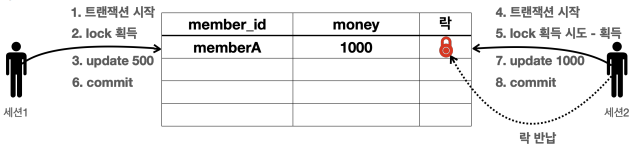 세션1은 memberA 의 금액을 500원으로 변경하고 싶고, 세션2는 같은 memberA 의 금액을 1000원으로 변경하고 싶다.