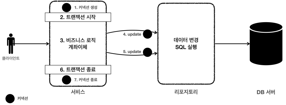 - 트랜잭션이 시작된 커넥션을 전달하면서 비즈니스 로직을 수행한다.