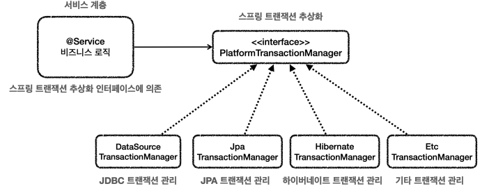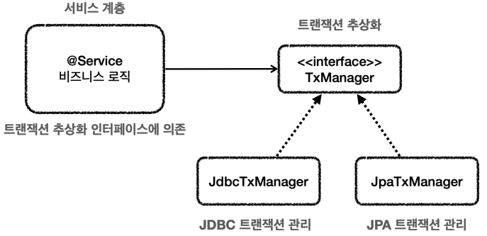 서비스는 특정 트랜잭션 기술에 직접 의존하는 것이 아니라, TxManager 라는 추상화된 인터페이스에 의존한다.