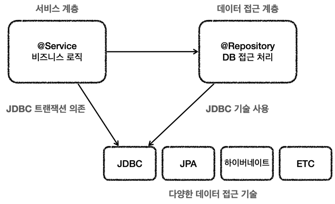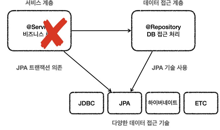 향후 JDBC에서 JPA 같은 다른 데이터 접근 기술로 변경하면, 서비스 계층의 트랜잭션 관련 코드도 모두 함께 수정해야 한다.