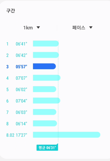 1 km 단위로 페이스 속도 기록이 나왔다.