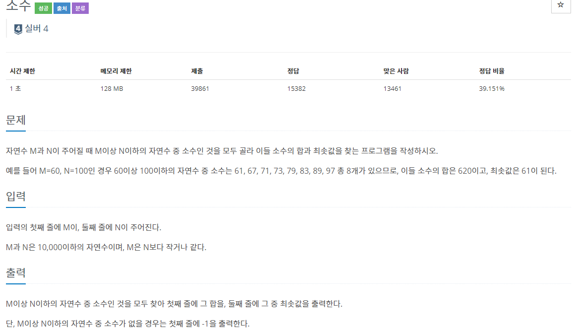 예를 들어 M=60, N=100인 경우 60이상 100이하의 자연수 중 소수는 61, 67, 71, 73, 79, 83, 89, 97 총 8개가 있으므로, 이들 소수의 합은 620이고, 최솟값은 61이 된다.