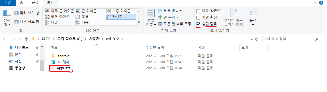 숨긴 항목을 체크해주면 AppData가 잘라내기 된 것처럼 투명한 것을 볼 수 있다.
