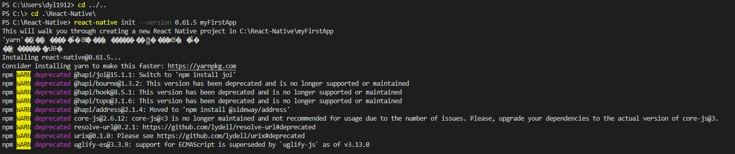 react-native init --version 0.61.5 myFirstApp 을 다시 실행하면 정상적으로 설치가 완료 되었다.